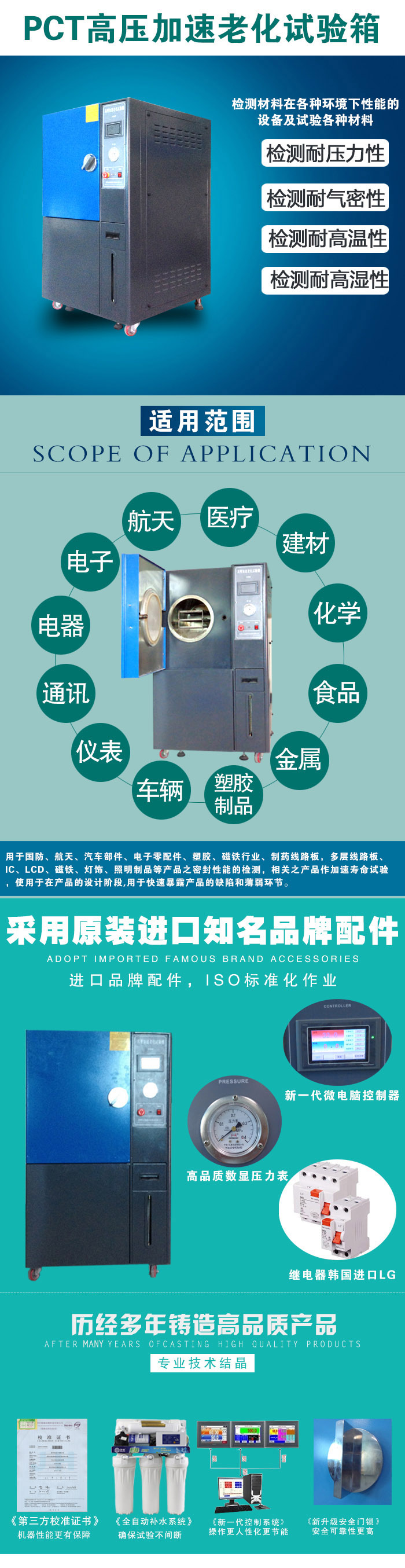 | 產(chǎn)品用途:高壓加速老化試驗(yàn)箱適用于國(guó)防、航天、汽車部件、電子零配件、塑膠、磁鐵行業(yè)、制藥線路板,多層線路板、IC、LCD、磁鐵、燈飾、照明制品等產(chǎn)品之密封性能的檢測(cè),相關(guān)之產(chǎn)品作加速壽命試驗(yàn),使用于在產(chǎn)品的設(shè)計(jì)階段,用于快速暴露產(chǎn)品的缺陷和薄弱環(huán)節(jié)。測(cè)試其制品的耐厭性,氣密性。 | |